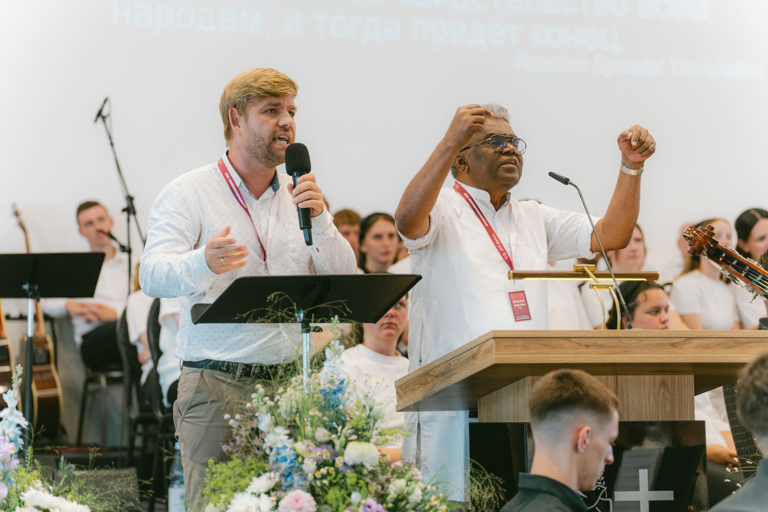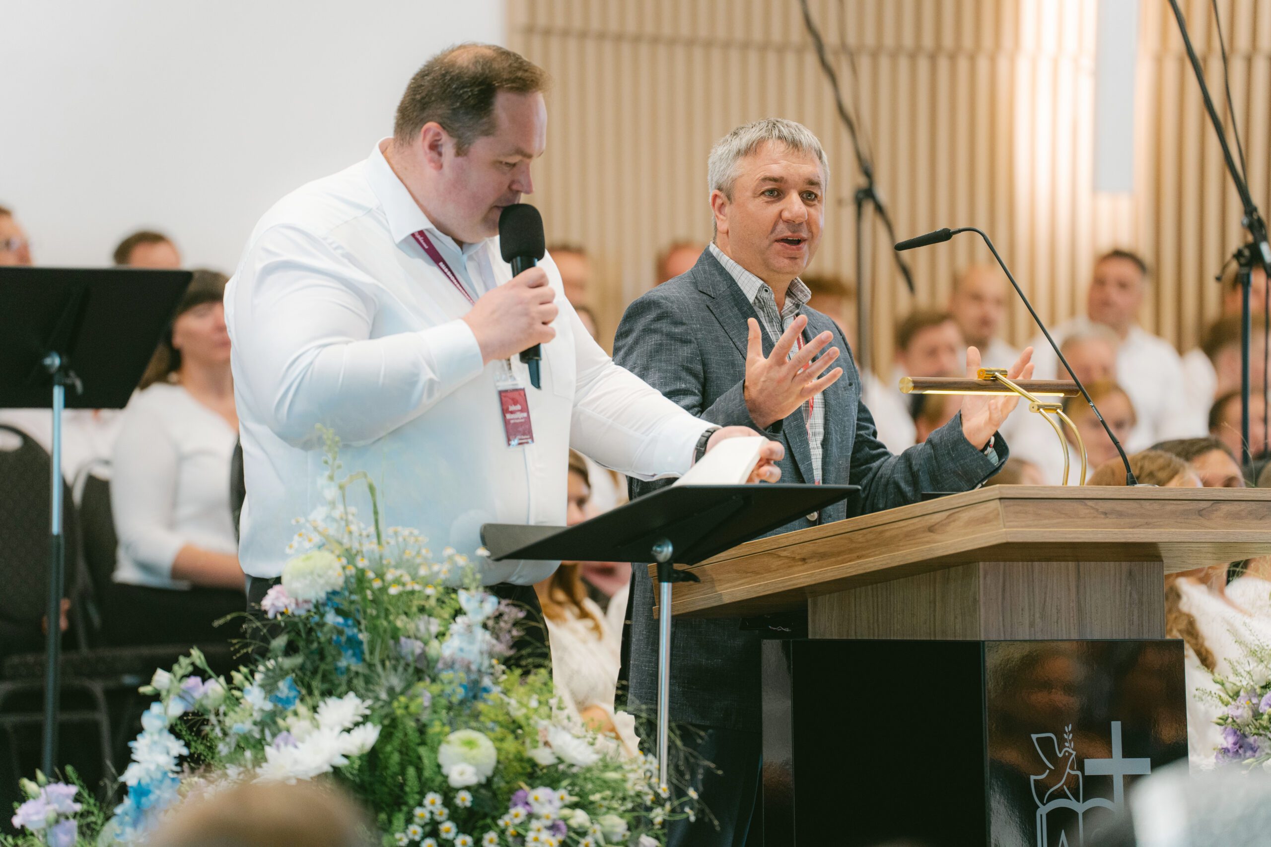 Im Abendgottesdienst lag der Fokus auf dem Gebet. Vladimir Matwejew, leitender Bischof aus Kirgisistan, leitete zum Gebet für verfolgte Christen ein. Auch er hat in seinem eigenen Land Erfahrungen mit Verfolgung gemacht. Eindrücklich bezeugte er, dass Gott viele verfolgte Christen nicht befreit, gerade damit auch in diesen Ländern noch Menschen von Jesu hören – besonders in muslimischen Ländern. Anschließend wurde für Frieden in den Kriegsgebieten weltweit gebetet.
